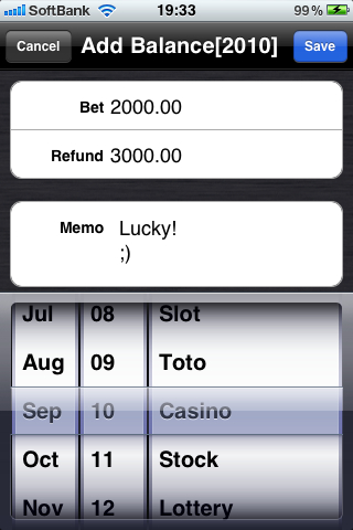 | iOS Version:Version 1.1[16/12/2010] *At the time of income and expenditure data addition, I revise it to choose the date of the last time or a date of the day automatically. *I revise it so that a screen does not turn with some screens. *I add an About screen. |