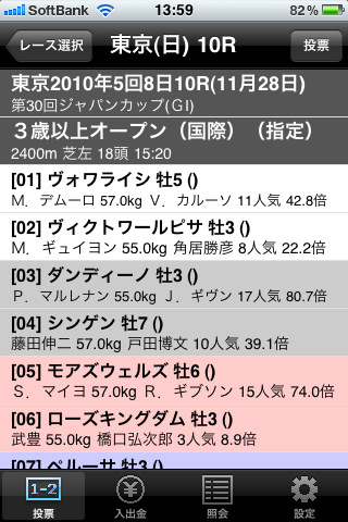 | Version 1.1[2011.01.06] * I revised it not to be able to choose the cancellation horse in a race to need a cancellation horse. * I revised race card is displayed normally. * I revised vote contents introduction is displayed normally. |